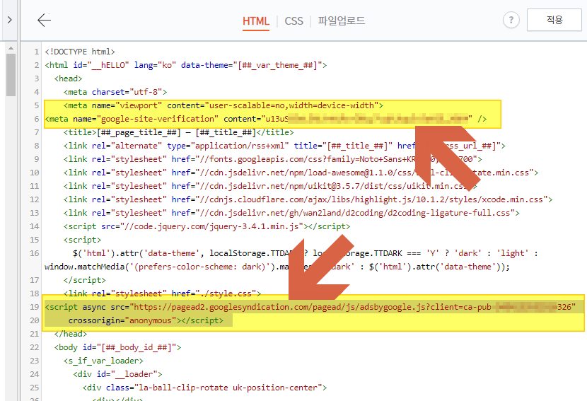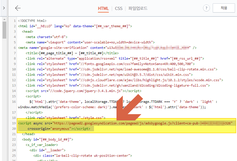 스킨 html 편집창에서 하면 된다. 아래 그림을 참고해서 비슷하게 수행하면 된다.