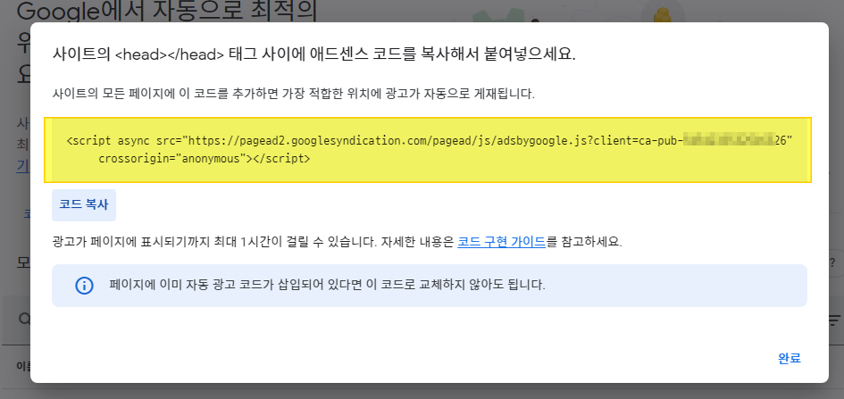 애드센스 페이지에서 메뉴> 광고 > 개요 부분에 가서 코드 가져오기를 누르면 아래와 같은 정보를 획득할 수 있다.
