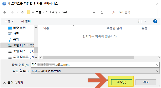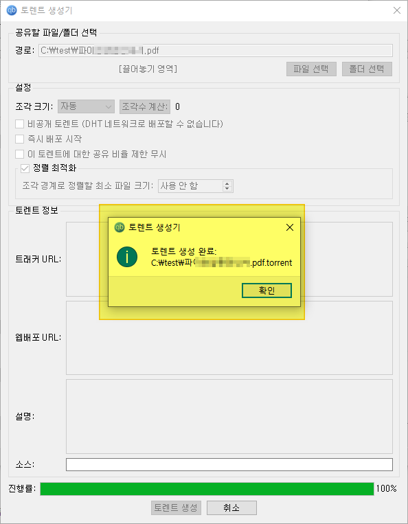 토렌트 파일을 저장할 위치를 지정하면 생성은 종료 된다.