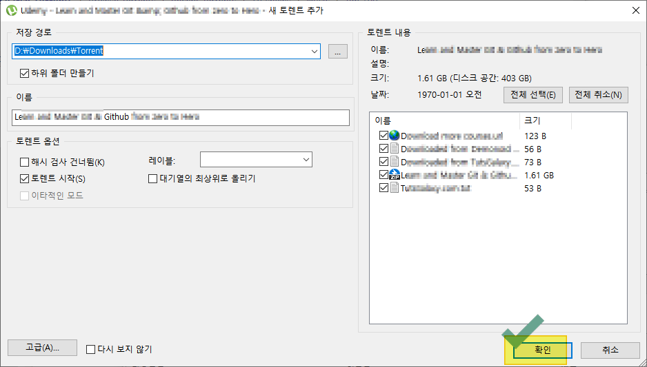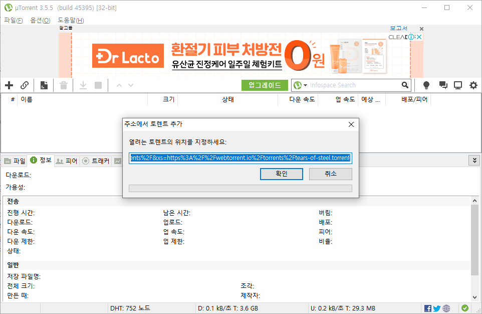 아래 같이 파일의 정보가 뜨면, 양호한 파일이다. 이제 마그넷 다운로드나 토렌트 파일을 다운로드 할 준비가 되었다. 확인을 누르면 된다.