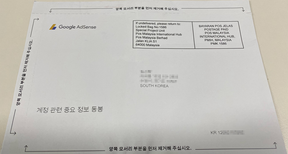 기다리던 구글 애드센스 PIN 번호 정보가 국제우편으로 도착했다. 이젠 애드센스 페이지에서 나의 주소 확인이 가능한 상태가 되었다는 얘기