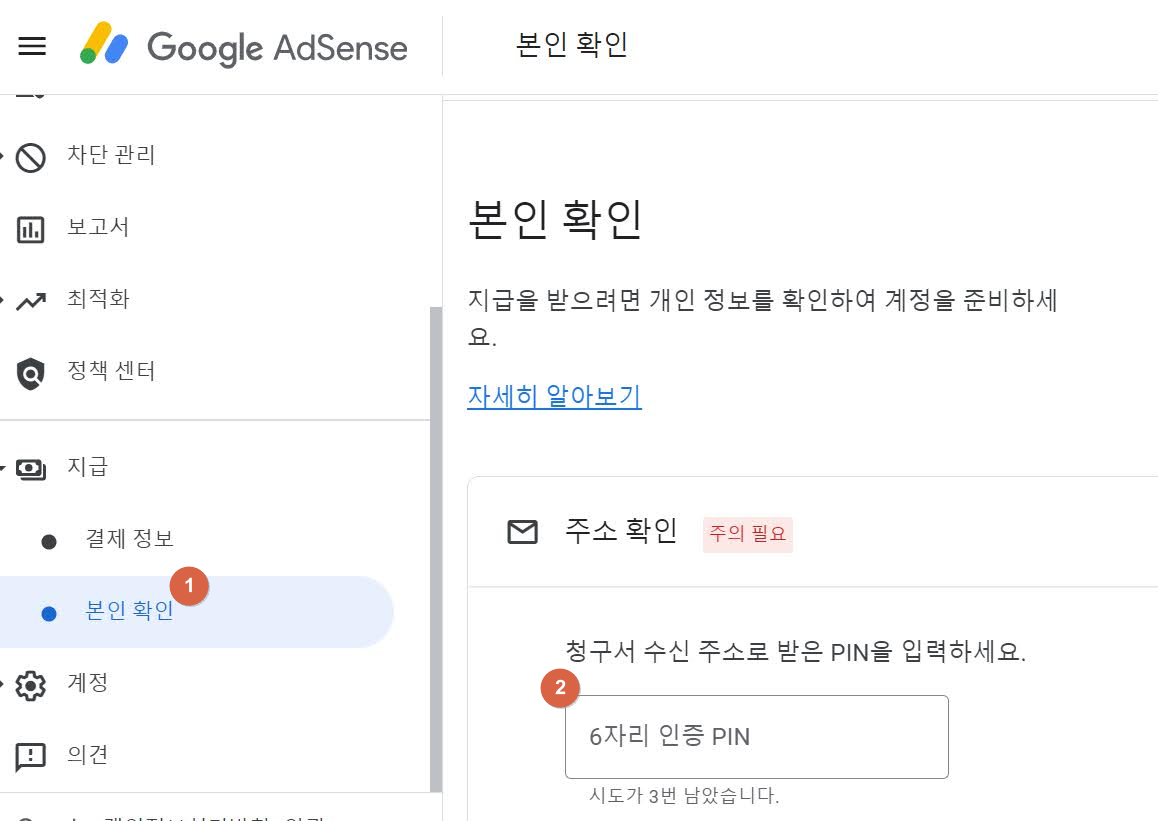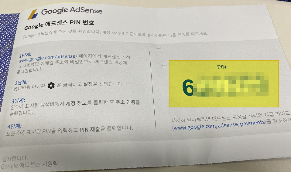 여기 지시대로 Adsense 페이지에 들어가서 계정 정보에서 PIN 번호 입력창에 이 번호를 넣으면 끝~