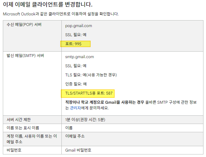 - 다음 정보를 사용하여 메일 클라이언트에 POP를 구성하세요.