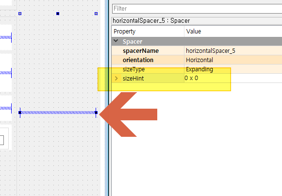 horizontalSpacer 나 verticalSpacer 컴포넌트를 그냥 가져다 놓으면 일정 수준의 사이즈 값이 들어와 있다. 40*20 인가 그랬는데, 그것도 일정 사이즈를 잡고 있는 것 같다.